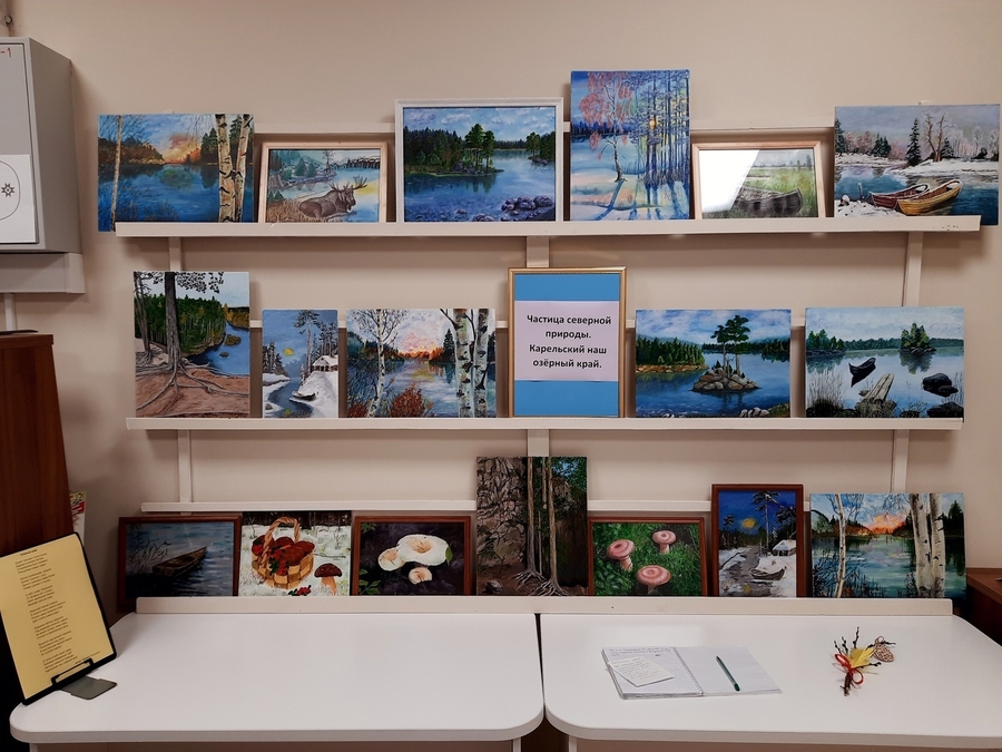 В рамках недели карельского языка в стенах читального зала Муезерской детской библиотеки была развёрнута художественная выставка картин «Частичка северной природы. Карельский наш озёрный край». Суровая природа в застывших скалах и валунах, стремящиеся ввысь деревья, корнями вцепившиеся в жёсткую землю, пожухлая трава, бескрайняя синева воды и неба - всё это находит живой отклик в нашей душе.