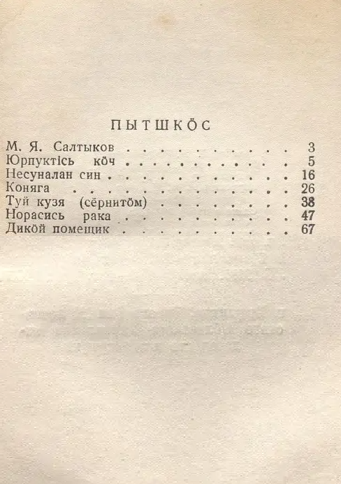 В отделе краеведения Коми-Пермяцкой центральной национальной библиотеки им. М.П. Лихачева хранится сборник избранных сказок М. Е. Салтыкова-Щедрина, переведенный на коми-пермяцкий язык в 1941 году И. И. Радостевой. В книгу вошли произведения: «Самоотверженный заяц» (Юрпуктісь кöч), «Ворона-челобитчик» (Норались рака), «Дикий помещик» (Дикöй помещик) и др.