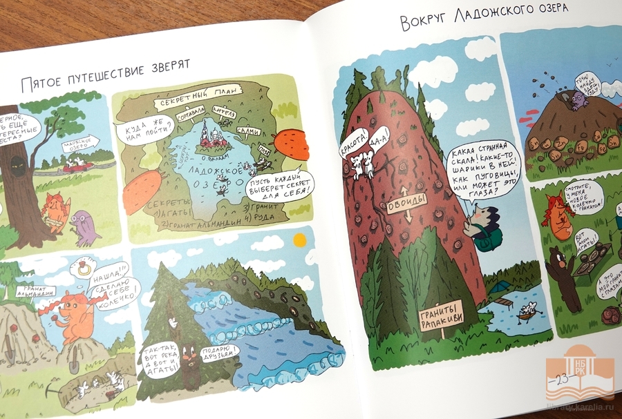 Издания опубликованы в рамках проекта «Каменная летопись Карелии: популяризация геологического и горно-индустриального наследия». В познавательных комиксах проводниками в мир геологии для читателей стали четверо любопытных зверьков: медвежонок Митя, лисичка Лиза, ежонок Игорек и кротенок Антон. В первом выпуске путешествие зверят проходит по маршруту гора Воттоваара - урочище Чертов стул (Петрозаводск) - палеовулкан Гирвас – Марциальные воды – Ялгора - деревня Белая гора – поселок Шуньга. Второй выпуск комикса посвящен путешествию по не менее примечательным местам с точки зрения геологии – это Рускеальский горный парк и озеро Янисъярви – водопад Кивач – река Укса – парк Каменный Бор (Петрозаводск). В занимательной форме маленькие читатели знакомятся с некоторыми терминами и геологическими событиями в истории нашего региона. Издания будут доступны на кафедре младшего и школьного возраста Центра детского чтения Национальной библиотеки.