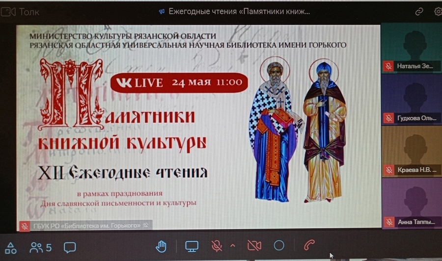 24 мая на базе Рязанской областной универсальной научной библиотеки им. Горького в гибридном формате состоялись XII Ежегодные чтения «Памятники книжной культуры», цель которых – привлечь внимание к вопросам сохранения и изучения мирового культурного наследия и национальных ценностей, обсудить результаты научно-исследовательской работы, обменяться опытом и укрепить сотрудничество между учреждениями культуры, образования и науки. В чтениях приняли участие специалисты библиотек, архивов, музеев, вузов, научно-исследовательских институтов, представители государственных структур и общественных организаций из 18 субъектов Российской Федерации и Республики Беларусь.