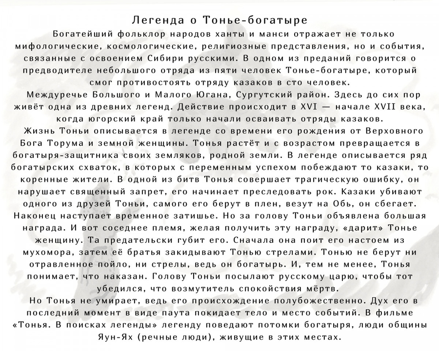 В основе графические листы (бумага, тушь, кисть) по мотивам легенды, бытующей и ныне у хантов реки Юган.